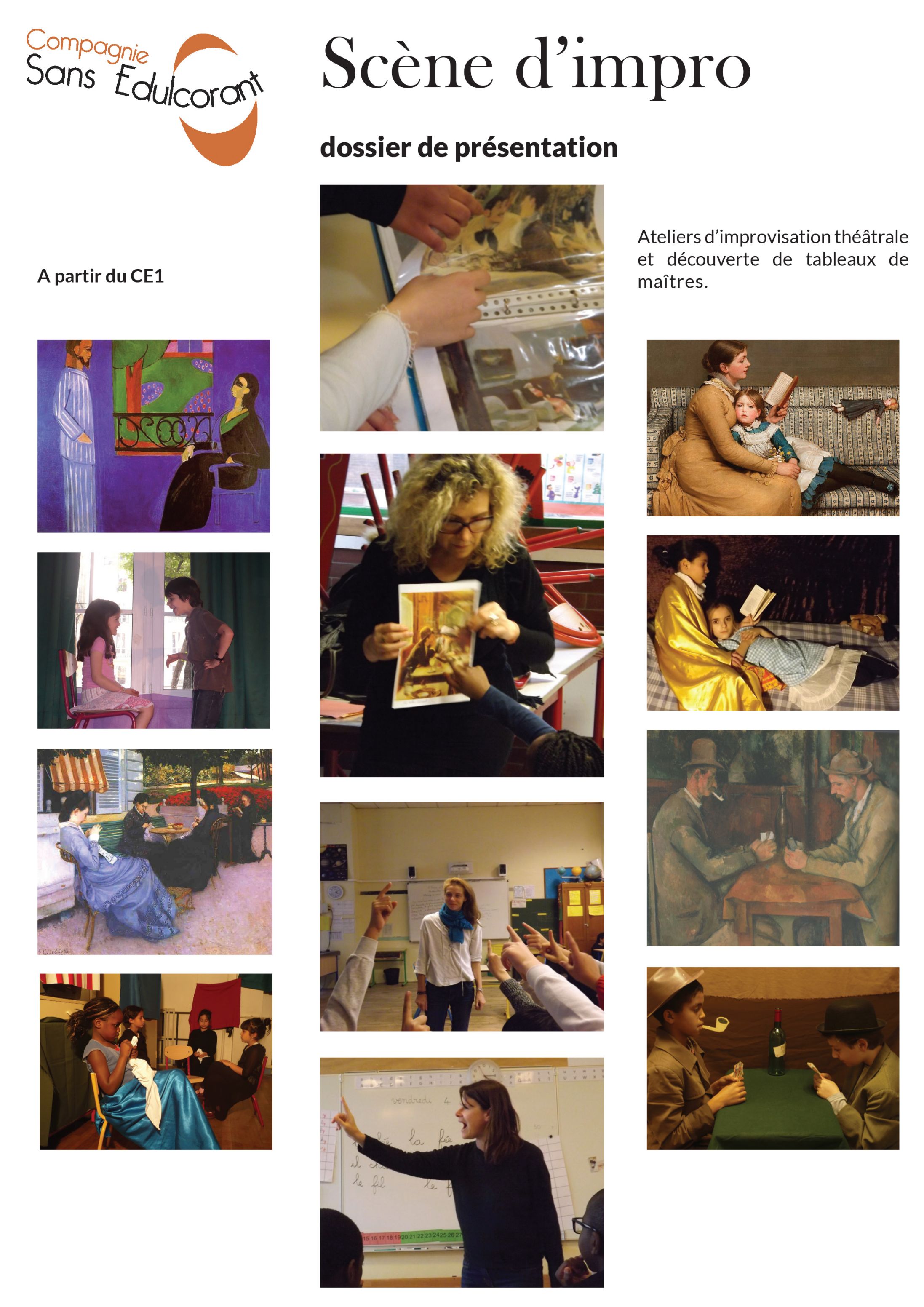 A partir de tableaux de maîtres représentant des scènes de genre, les participants improvisent personnages et histoires. Ces histoires sont ensuite retravaillées, toujours en jeu, de façon à produire une saynète « écrite » avec les corps, la voix et leurs interactions. On aboutit ainsi à une écriture collective, inspirée d'un tableau, et déjà mis en scène.