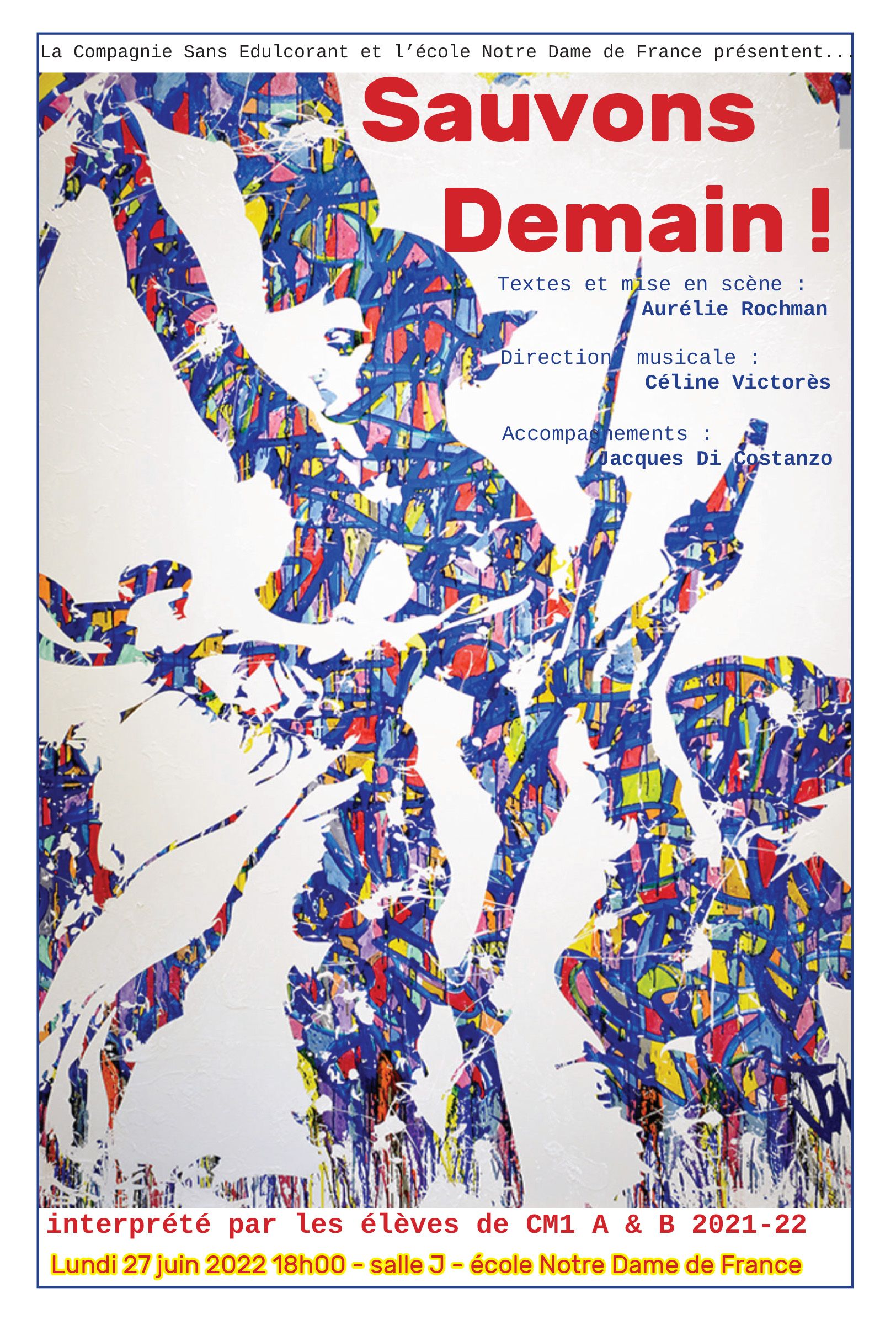 La Compagnie Sans Edulcorant met son savoir-faire, ses artistes et techniciens à la disposition d’enseignants désireux de faire vivre l’expérience et l’exigence de la scène à leurs élèves par le biais du programme Scolaires en Scène. Poursuivant son action de promotion du spectacle vivant comme facteur de l’individuation psychique et collective indispensable au vivre ensemble, la Cie crée des spectacles de comédie musicale sur-mesure, en concertation avec les enseignants. L’équipe qui encadre les enfants est professionnelle, avec un auteur-metteur en scène, un chef de choeur, un ou plusieurs musiciens, un chorégraphe le cas échéant. Les enfants sont mis en situation d’être des artistes et plus des élèves. En classe, les enseignants travaillent les thèmes choisis via toutes les disciplines : français, histoire, arts plastiques, éducation civique etc. Les représentations finales mêlent artistes professionnels et enfants, dans un spectacle mis en lumière.