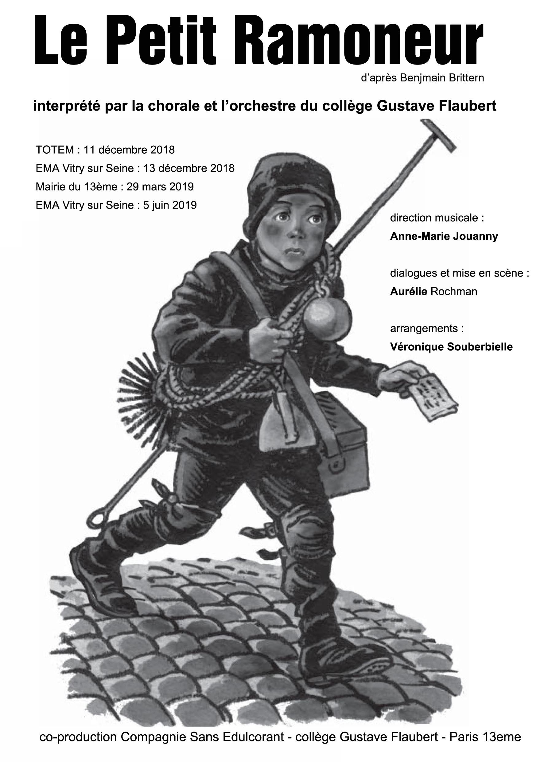 Le Petit Ramoneur a été joué au Totem (Paris 13ème) et au conservatoire de Vitry sur Seine en décembre 2018, repris en mars 2019 pour le Printemps des poêtes à la mairie du 13ème, et à nouveau aux EMA de Vitry Sur Seine en juin 2019.